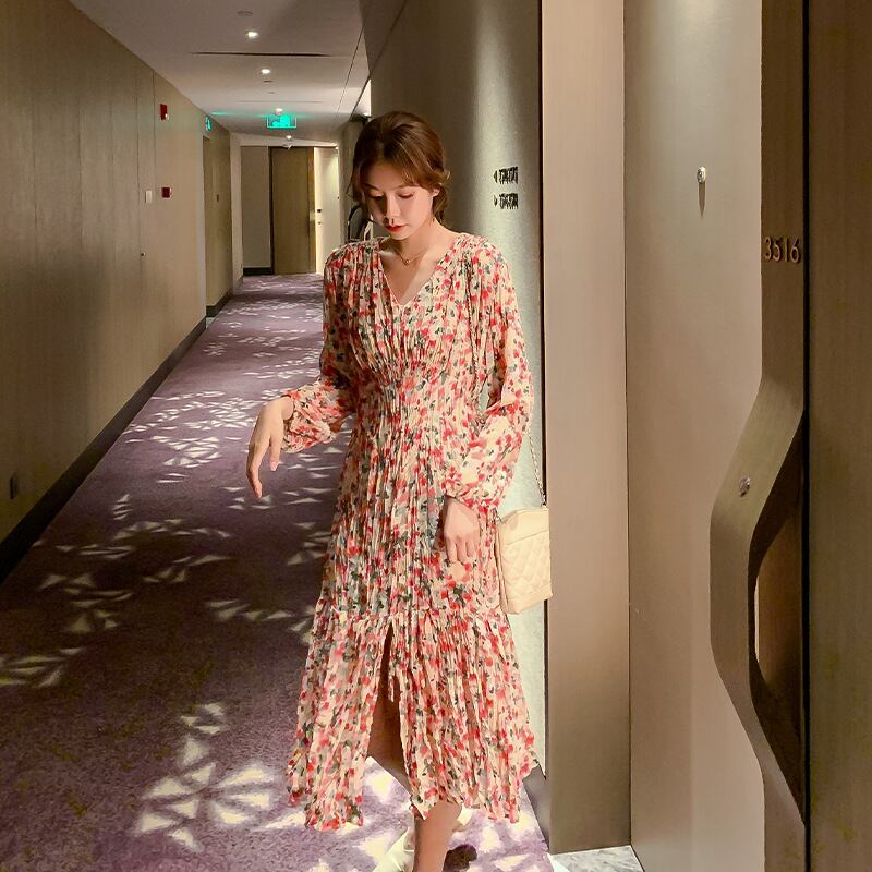 ドレス ワンピースシフォンスカート スタンダード花柄 お花 フラワー長袖 長そでスリーブ 袖Vネック ロング マキシロング丈 マキシ丈 レトロ 女性 レディース フェミニン系6656431 | nice import1 a5