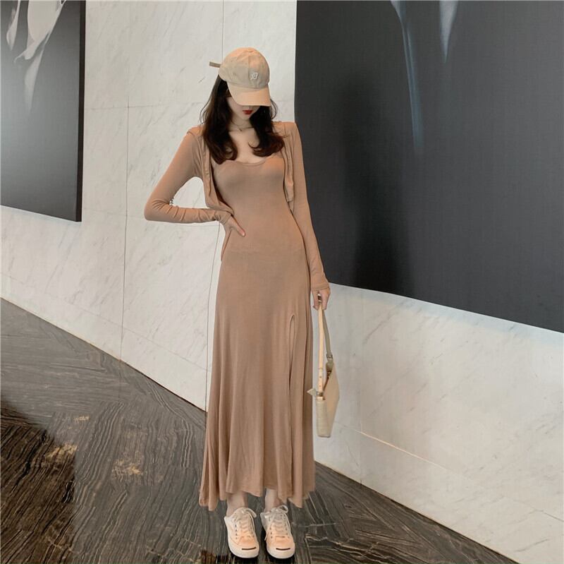 色:グレーのカーディガン,グレーのドレス,ヌードカーディガン,ヌードドレス