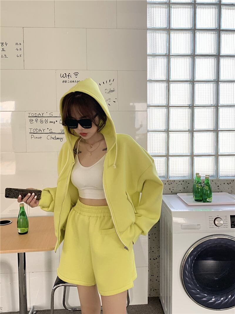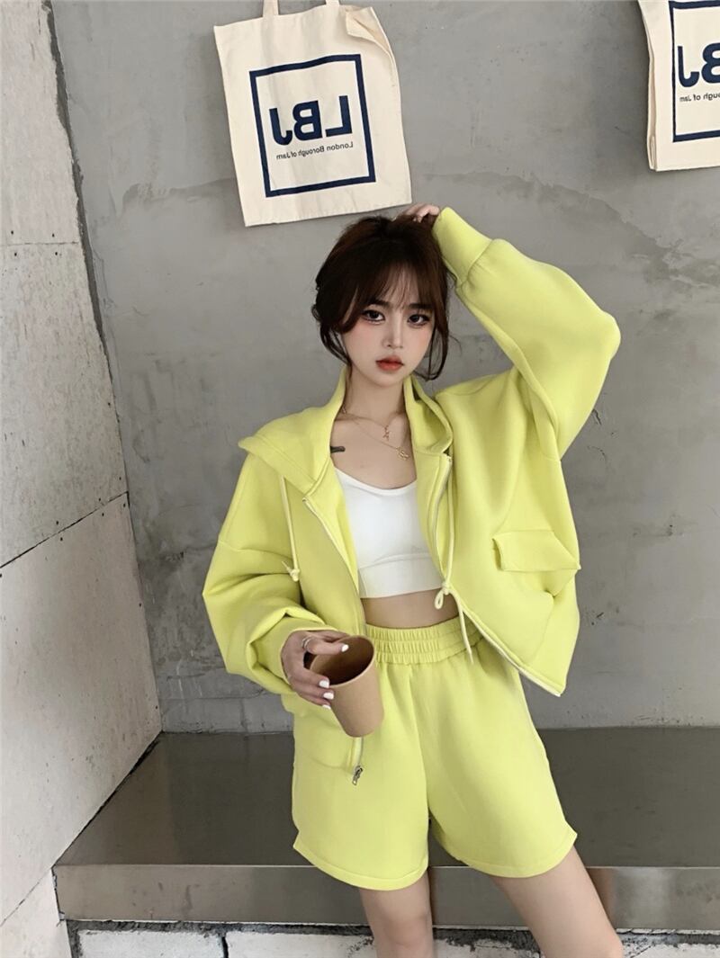 色:蛍光イエローのショートパンツ,グレーのショートパンツ,黒のショートパンツ,蛍光黄色のパーカー,グレーのパーカー,ブラックパーカー