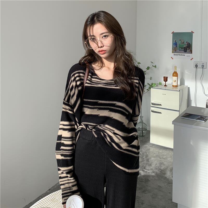 スタンダードルーズブラウス ストライプカジュアルニット セーター ロング マキシロング丈 マキシ丈 レトロ シャツ トップス 女性 レディース 可愛い系72347340606 | nice import1 a5