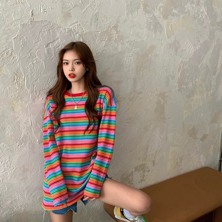 カジュアルルーズカラーストライプラウンドネックプルオーバー ニット セーターレディース ロング マキシロング丈 マキシ丈 女性 レディース 可愛い系1391822208