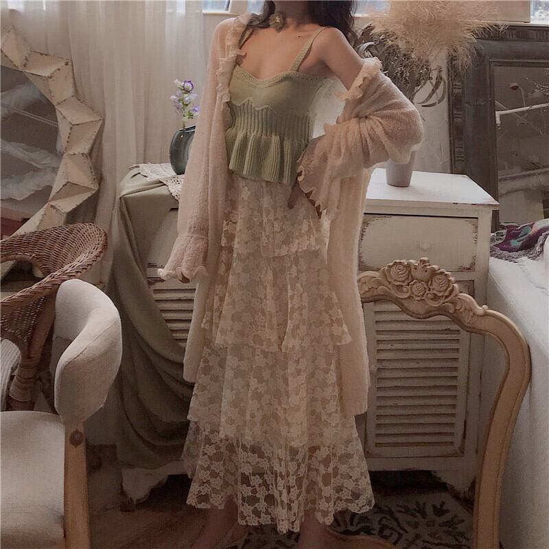 色:温かみのあるビーングリーンのキャミソール,レーススカート,ライトベージュカーディガン