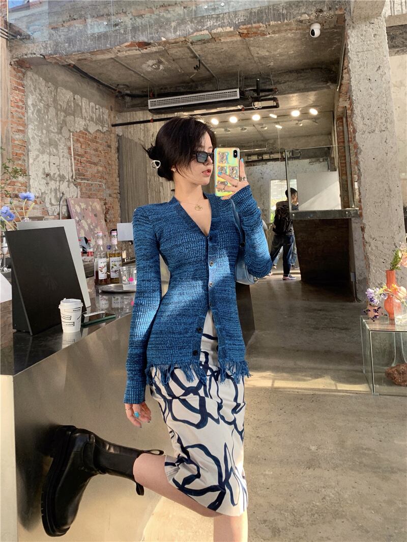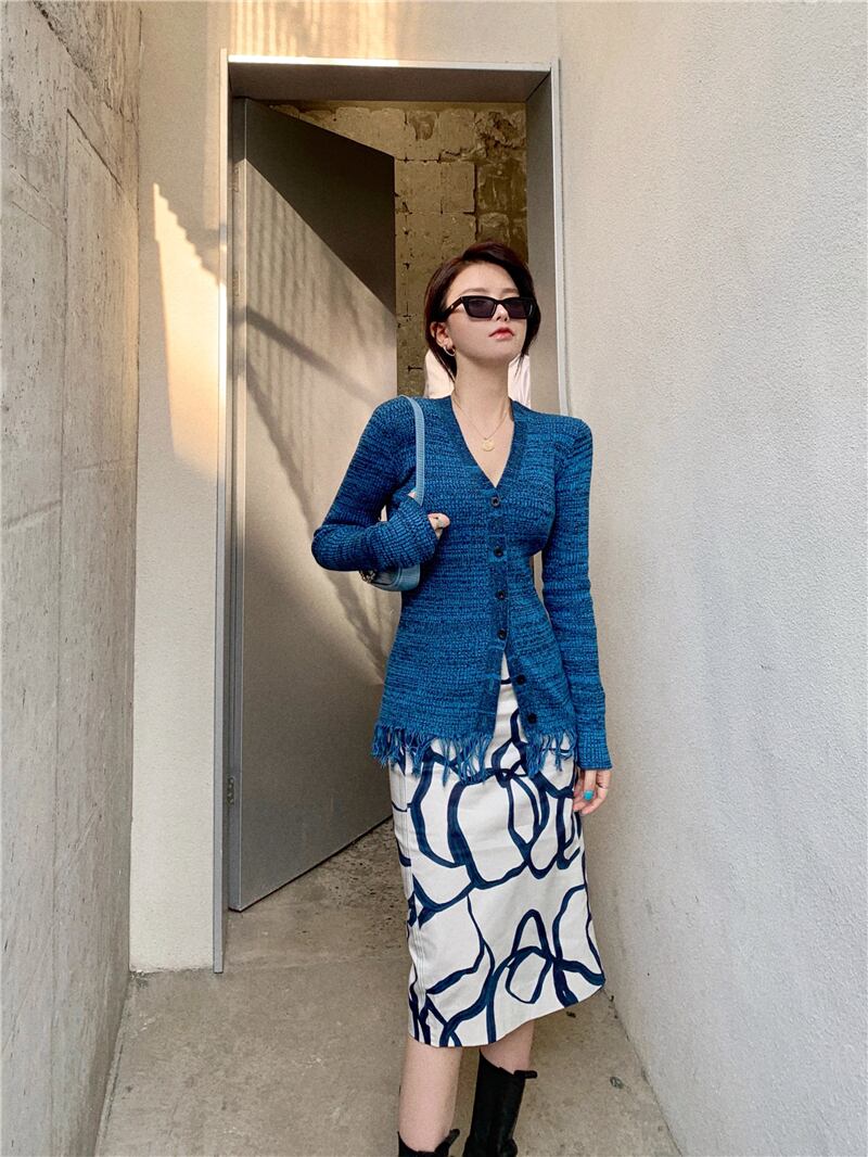 ホワイト 白ブルー 青ニットカーディガン 上着ジャケット 上着 コートストライププリント柄ハイウエストウエストAラインスカート ハイウェスト 女性 レディース 可愛い系17156388964 | nice import1 a5