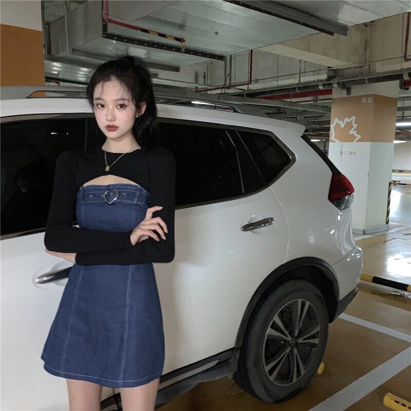 色:黒のブラウス,デニムキャミソール