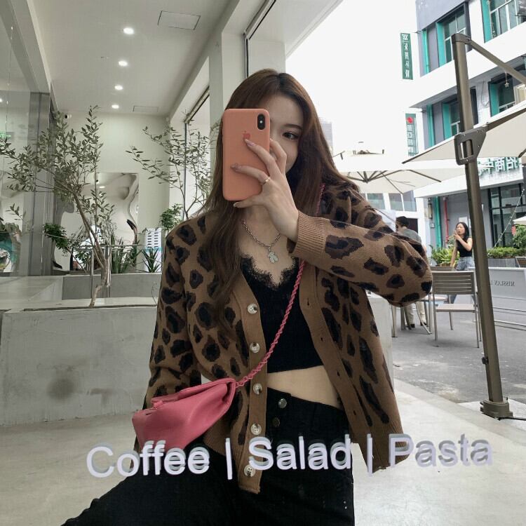 スタンダードスタイルレオパードプリント柄ニット セータージャケット 上着 コート レトロ 女性 レディース 可愛い系79970614336