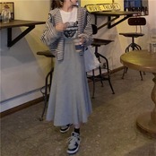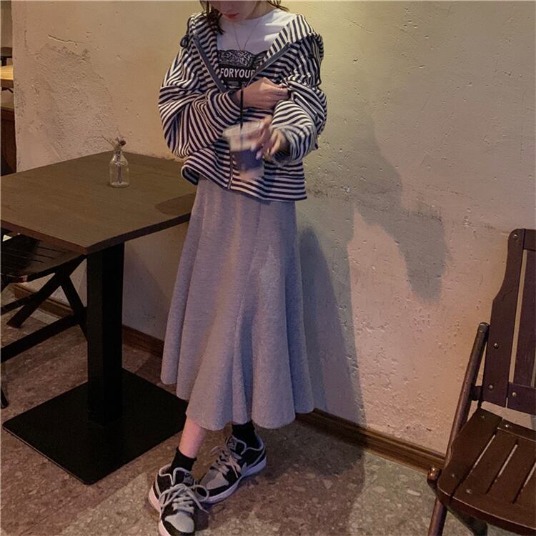 色:ストライプコート,黒スカート,グレースカート,白い長袖tシャツ,グレー長袖Tシャツ