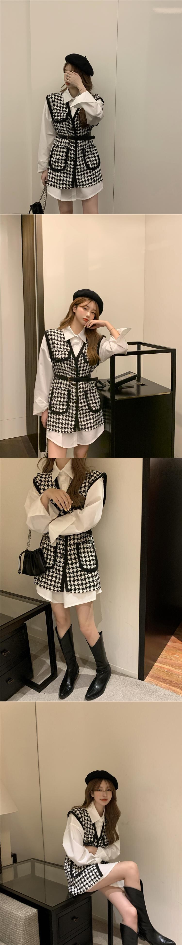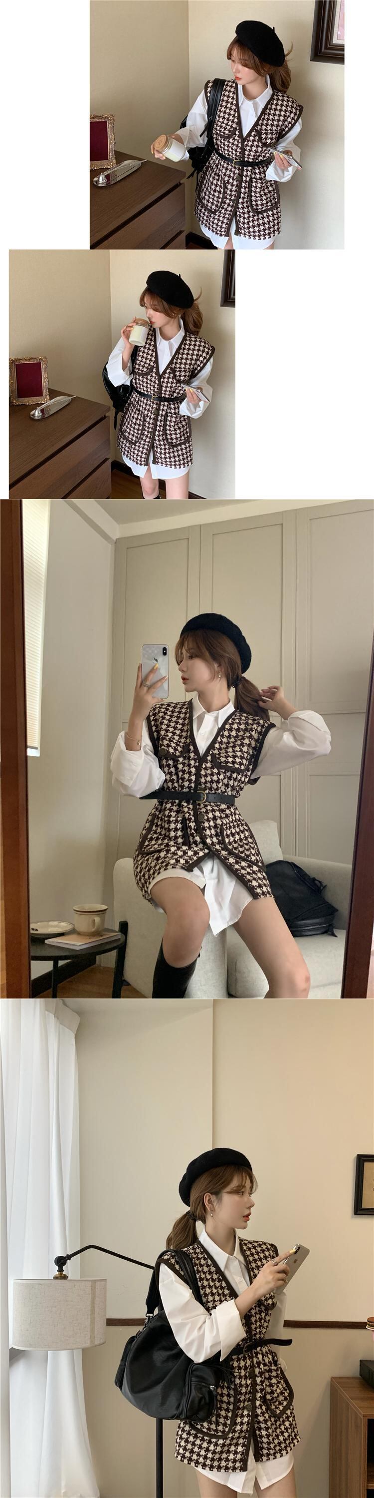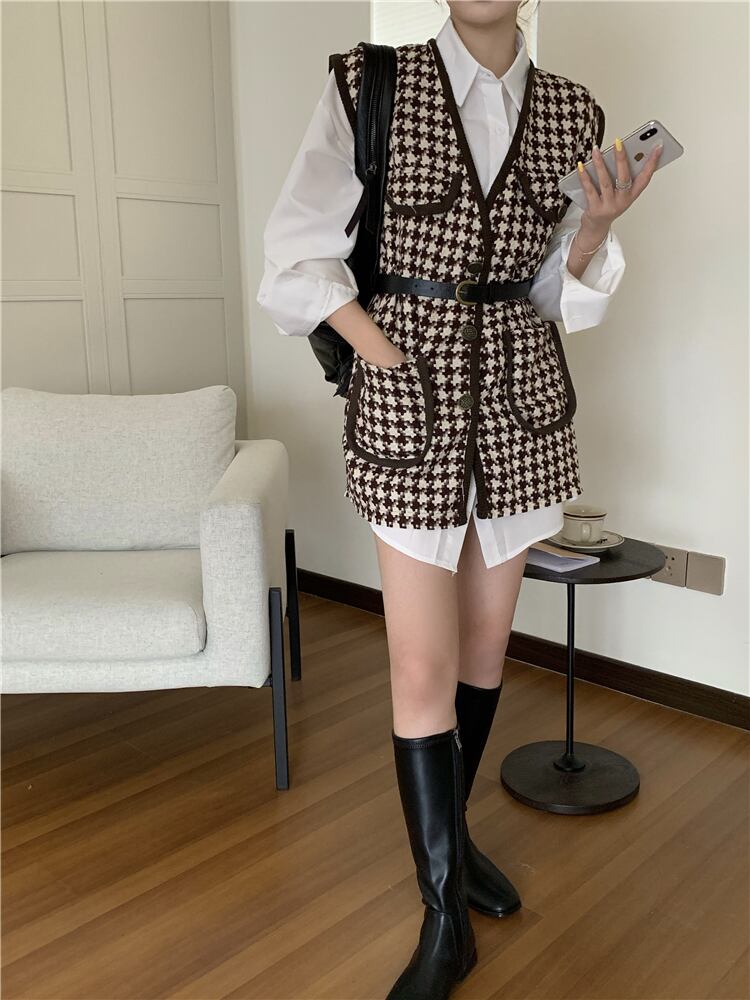 色:白のシャツ,コーヒーカラーのチェック柄センドベルト,黒のチェック柄センドベルト