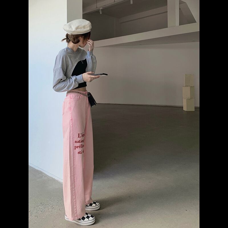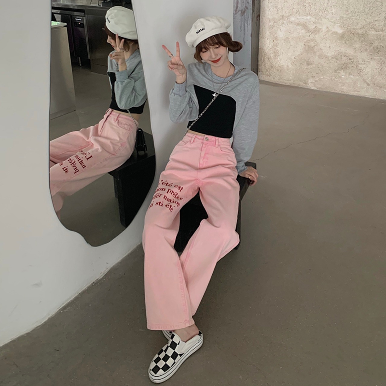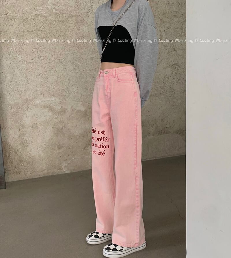ジーンズ デニムルーズカジュアルプリントワイドレッグパンツ ハイウエストウエスト ハイウェスト ピンク ワイドパンツ 女性 レディース 可愛い系1232980444 | nice import1 a5