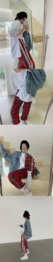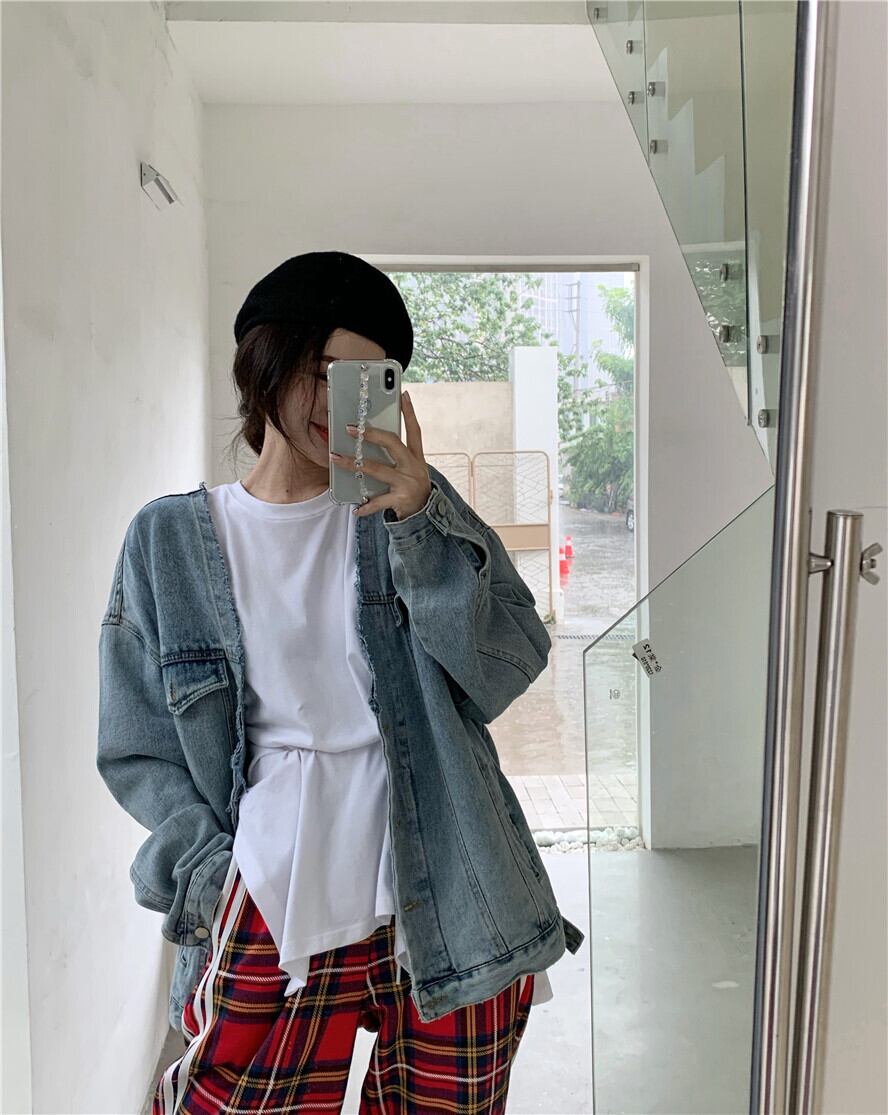 色:ライトブルーデニムジャケット,赤いチェック柄パンツ,白いTシャツ
