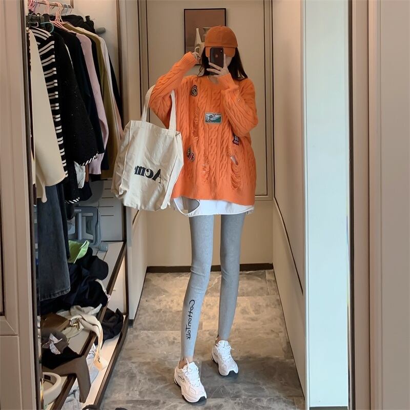 ルーズパターンラウンドネック長袖 長そでスリーブ 袖プルオーバー ニット セーターカラーTシャツ レギンス ロング マキシロング丈 マキシ丈 ピュア 女性 レディース 可愛い系37733534927