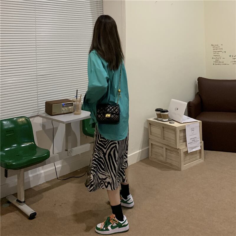 色:レイクブルーとグリーンのシャツ,ゼブラ柄スカート