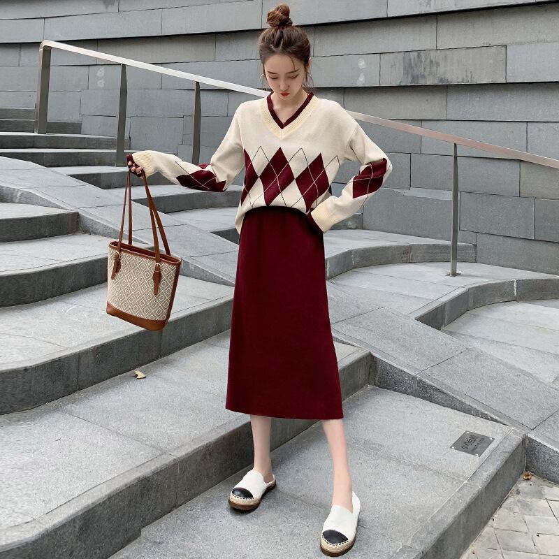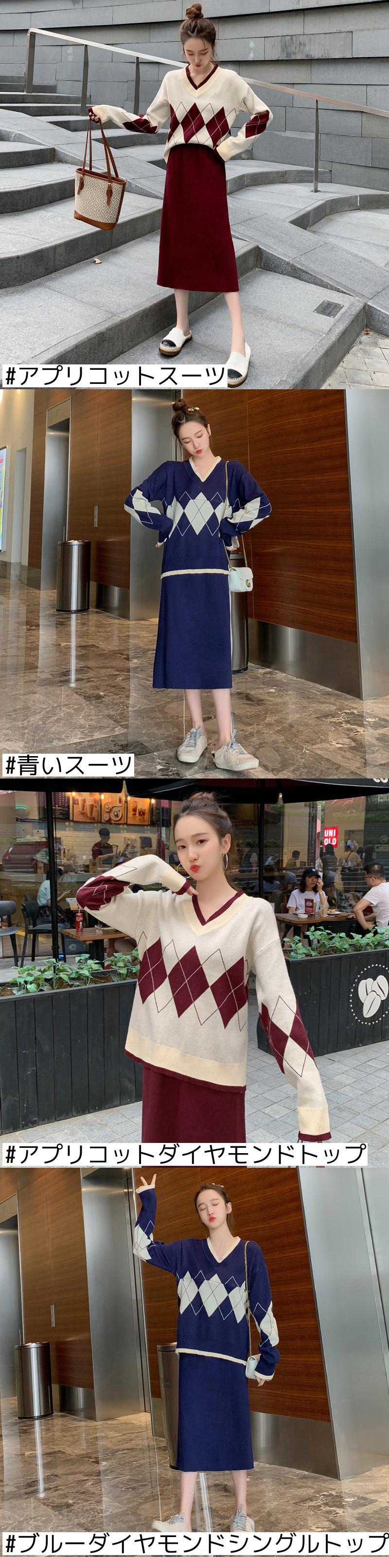 色:アプリコットスーツ,青いスーツ,アプリコットダイヤモンドトップ,ブルーダイヤモンドシングルトップ,コーヒーカラーのシングルスカート,青いシングルスカート