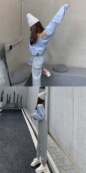 色:白いセーター,青いセーター,グレーのズボン,黒いズボン