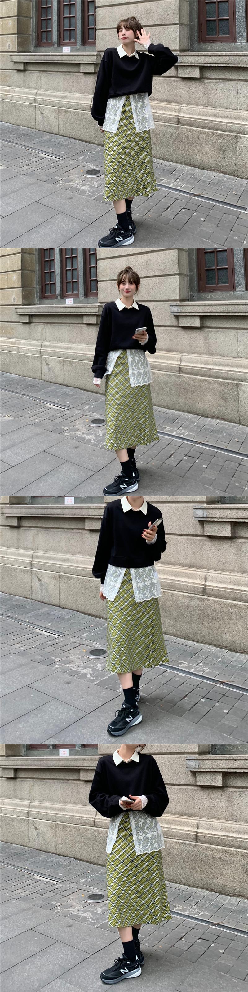 色:黒のセーターワンピース,ワンピースのレースシャツ,格子縞のスカートのシングルピース