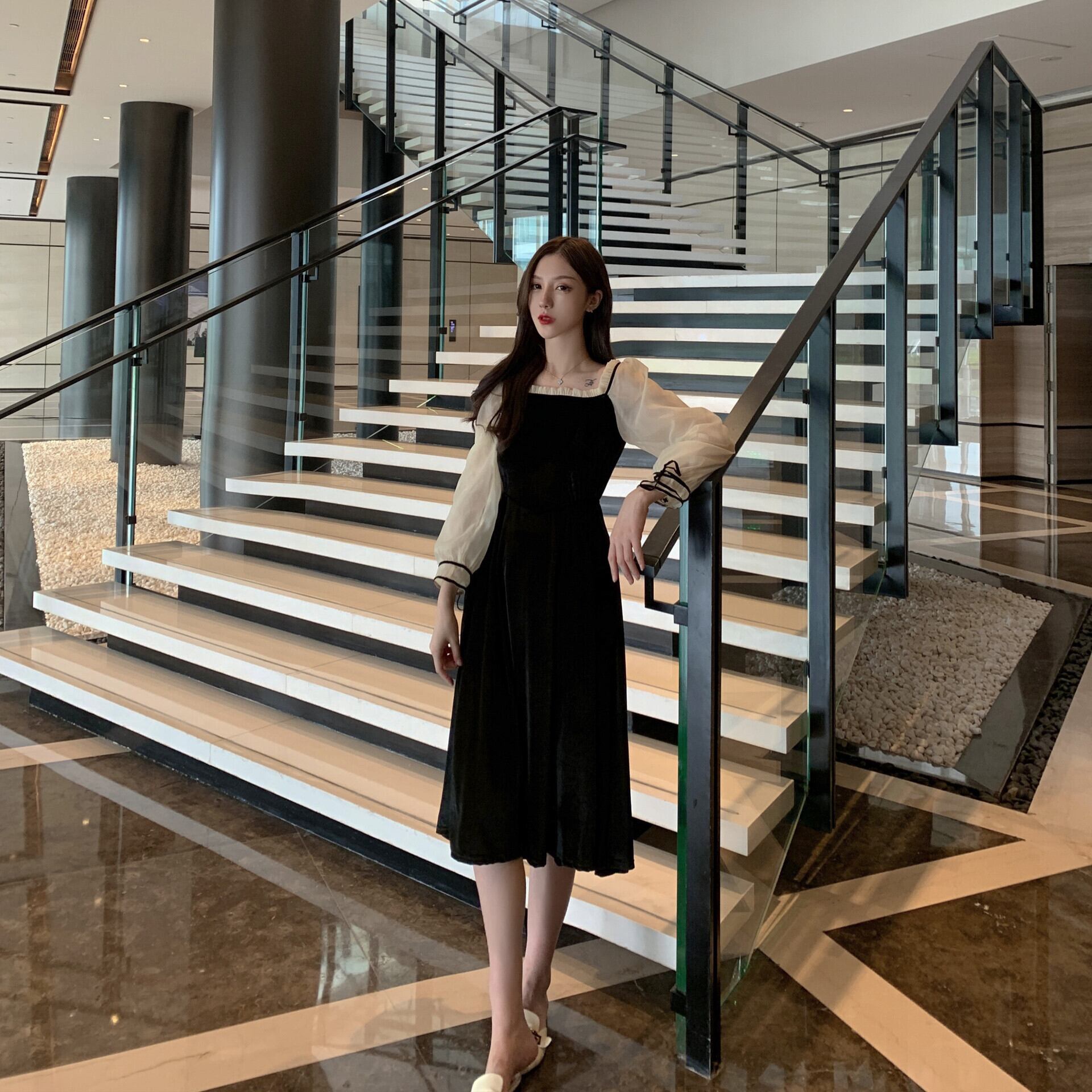 ウエスト薄手シフォンブラック 黒ホワイト 白長袖 長そでスリーブ 袖ドレス ワンピース ロング マキシロング丈 マキシ丈 女性 レディース フェミニン系35735072639 | nice import1 a5