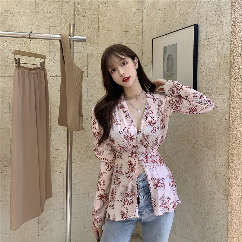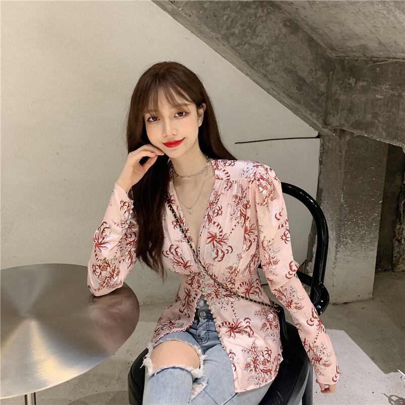 サテン サテン生地スタンダードシャツ Vネックウエストプリントレディース ロング マキシロング丈 マキシ丈 レトロ 女性 レディース 可愛い系8453771741