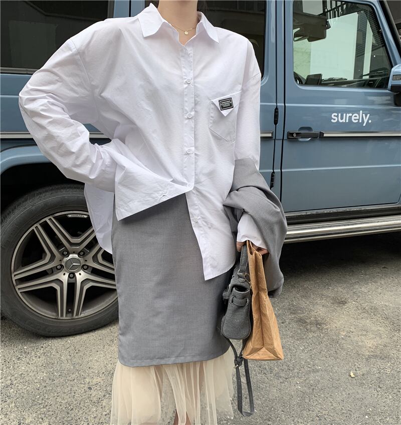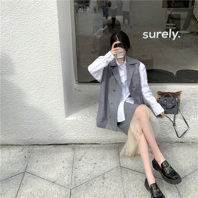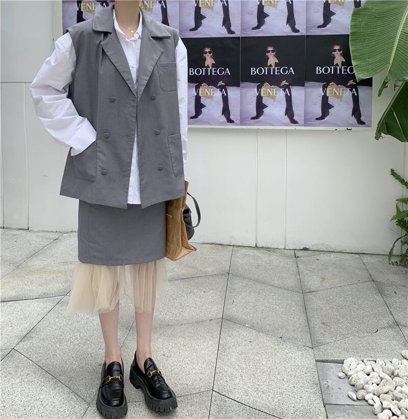 色:グレーのベスト,グレースカート,白のシャツ