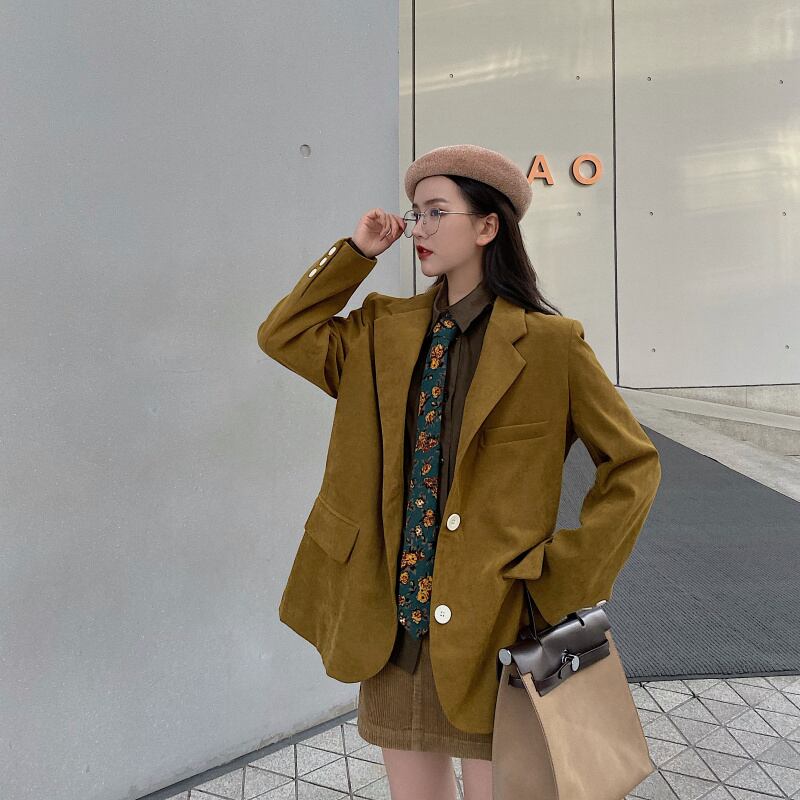 色:スーツ,コーヒーシャツ,ヴィンテージ花ネクタイ,Aラインスカート