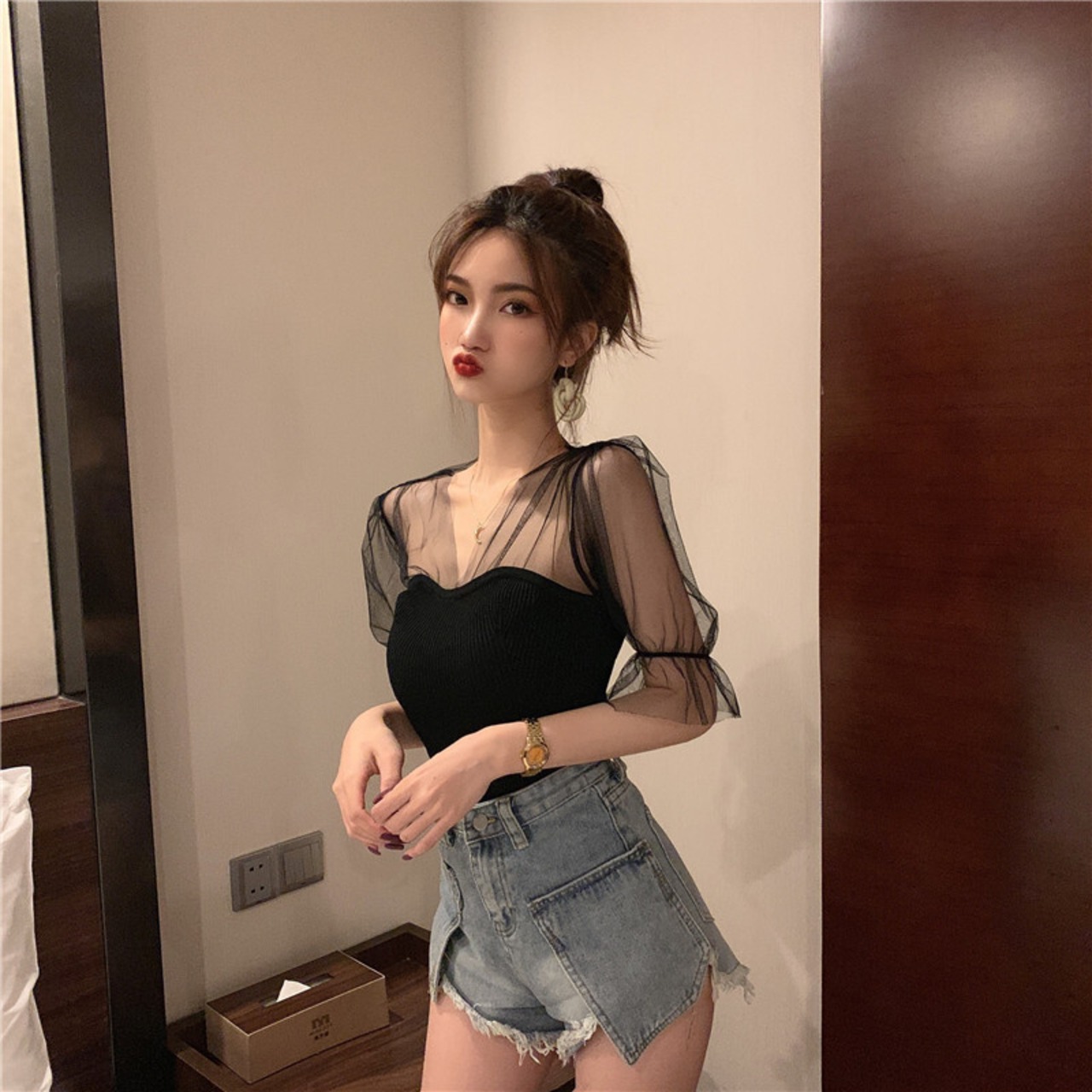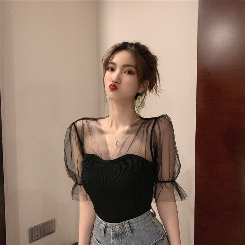 メッシュ レース シースルー チュール オーガンジーニットニット セータープルオーバー Vネックシャツ トップス ショート ショート丈 ミニ ミニ丈 ステッチ 女性 レディース フェミニン系62630625544