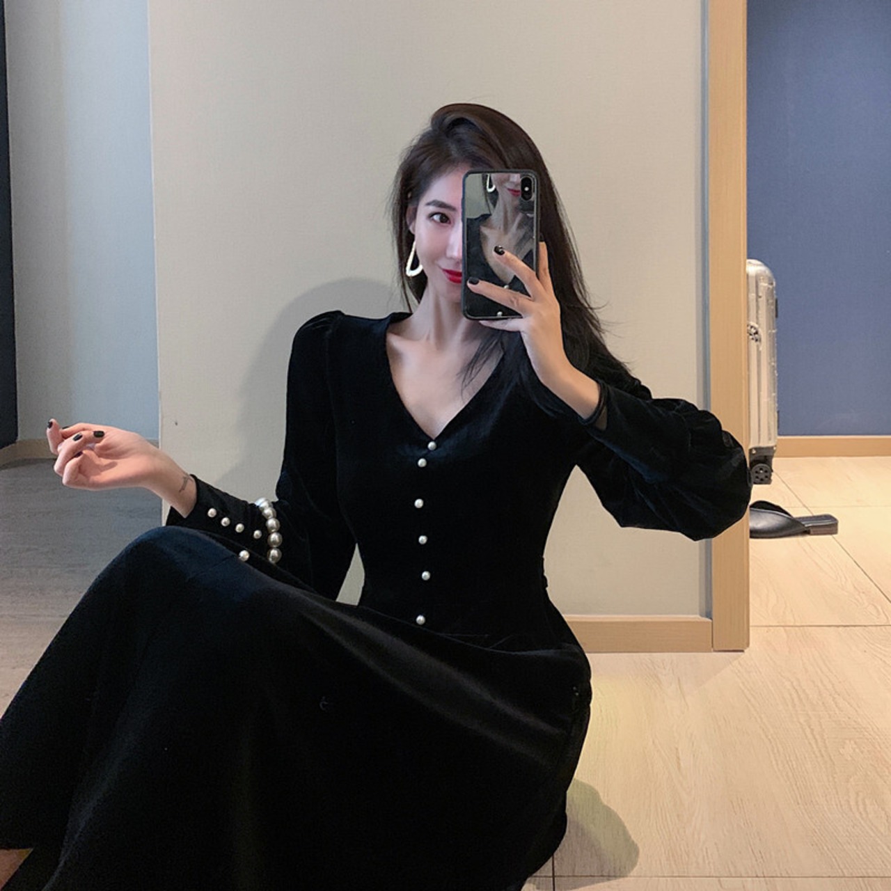 スタンダードドレス ワンピースベルベットロング マキシ ロング丈 マキシ丈ブラック 黒 マキシロング丈 レトロ 女性 レディース フェミニン系82338909948