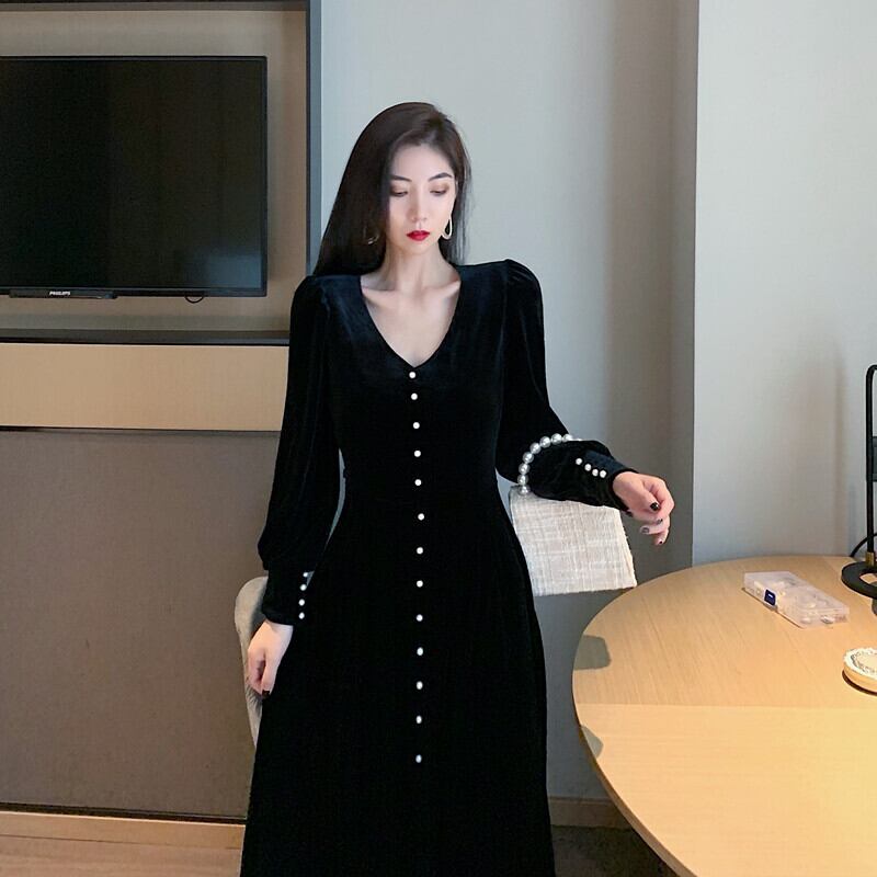 スタンダードドレス ワンピースベルベットロング マキシ ロング丈 マキシ丈ブラック 黒 マキシロング丈 レトロ 女性 レディース フェミニン系82338909948 | nice import1 a5
