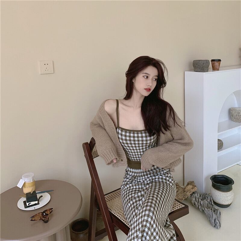 色:カーディガン,格子縞のスリング,チェック柄スカート