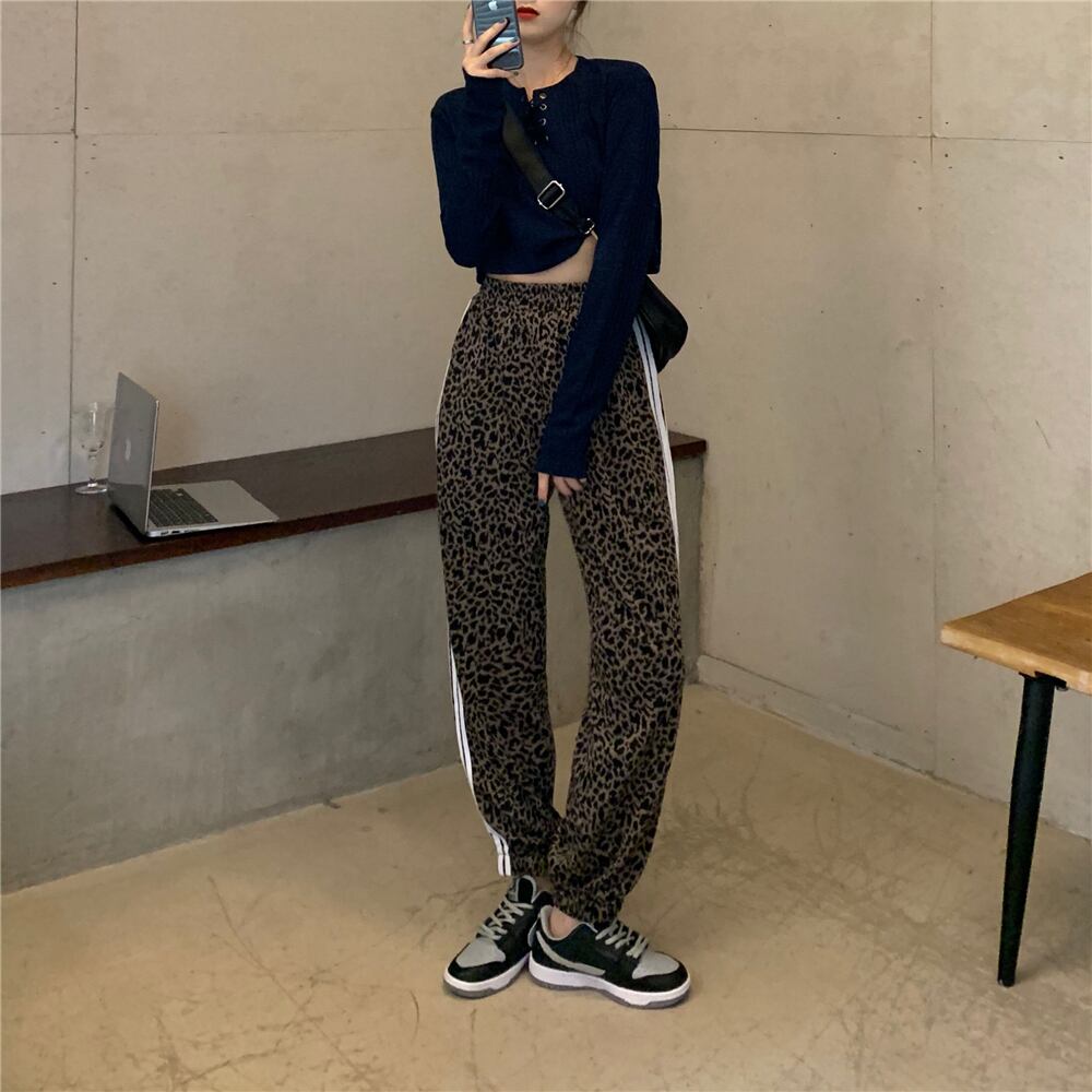 レオパードプリント柄カジュアルパンツ 薄手ウエストハイウエストルーズ ハイウェスト 女性 レディース 可愛い系77923008051