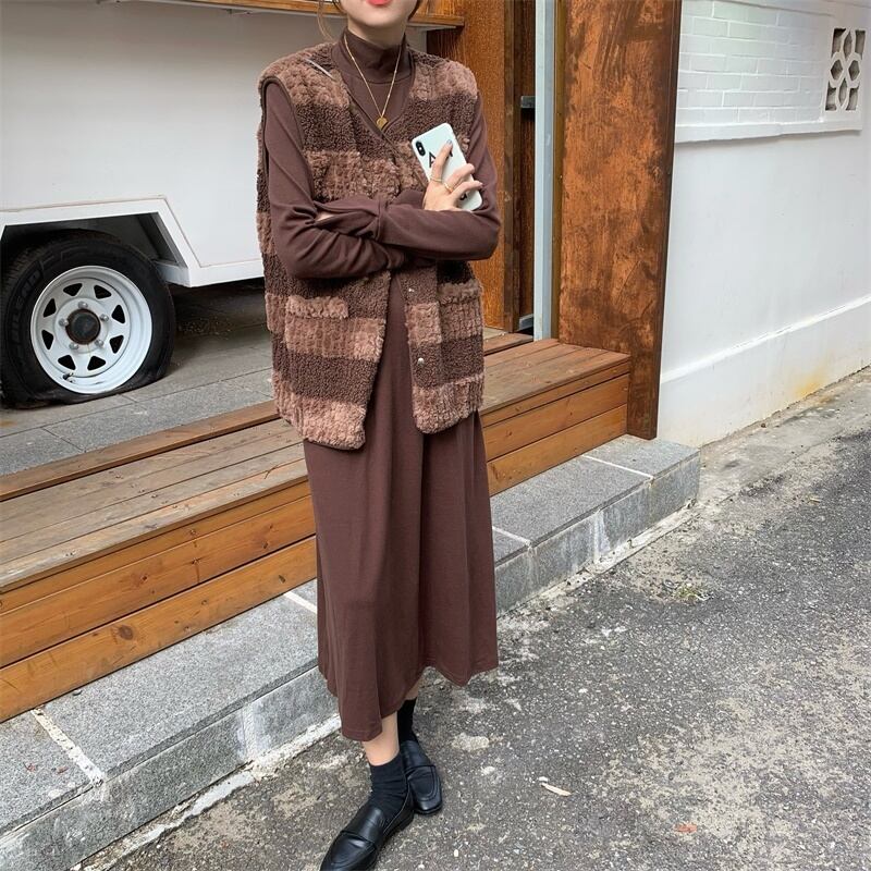 色:バッグ付きグレーベスト,バッグ付きコーヒーカラーベスト,グレーのドレス,コーヒー色のドレス