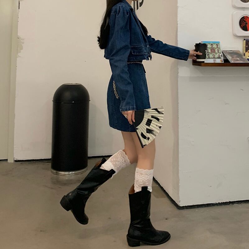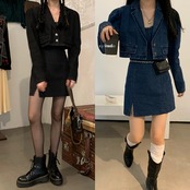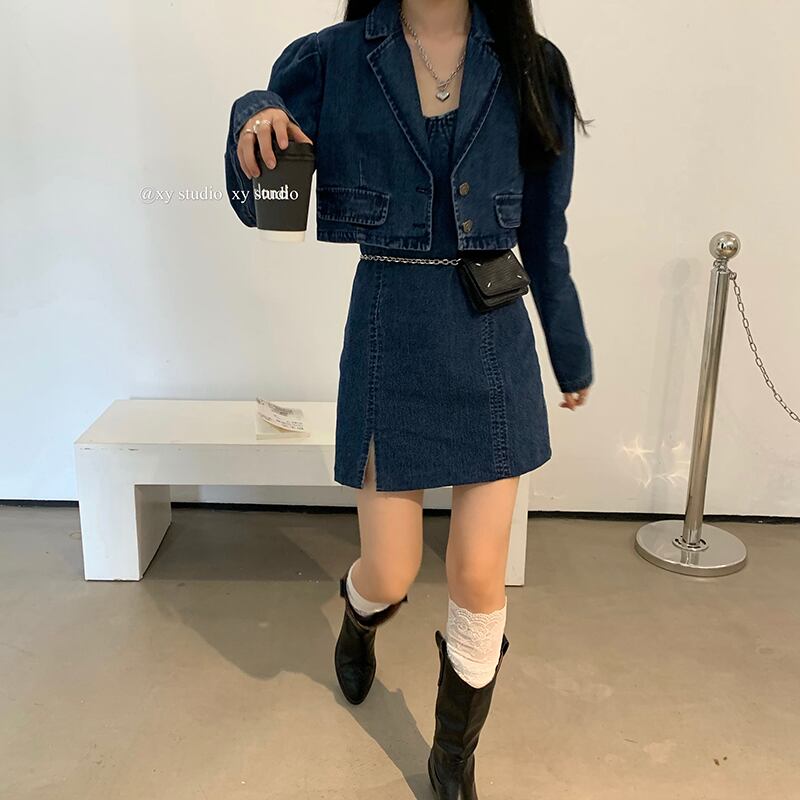 色:ダークブルーのキャミソール,ブラックサスペンダースカート,ダークブルーコート,黒いジャケット,タートルネックプリントのボトミングシャツ