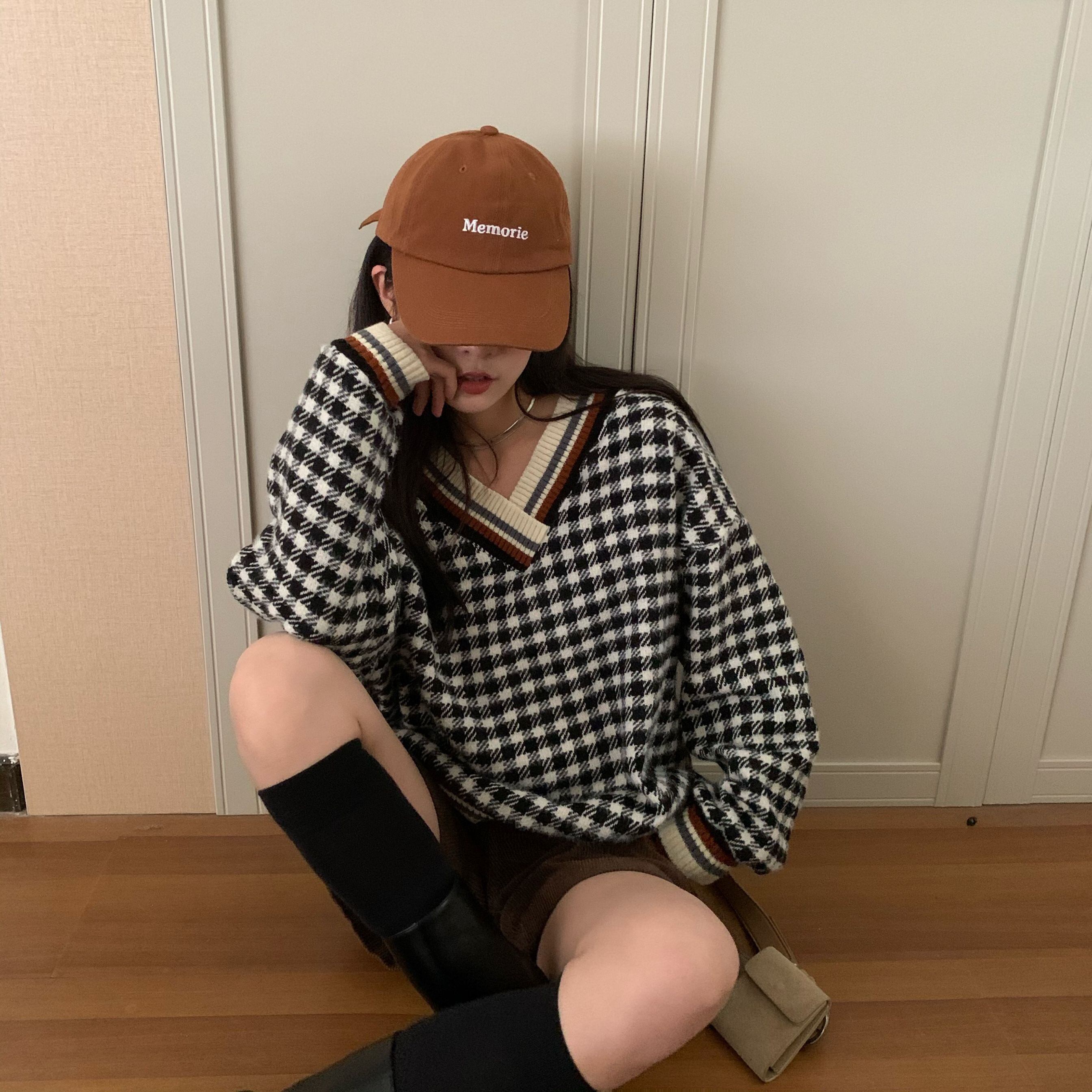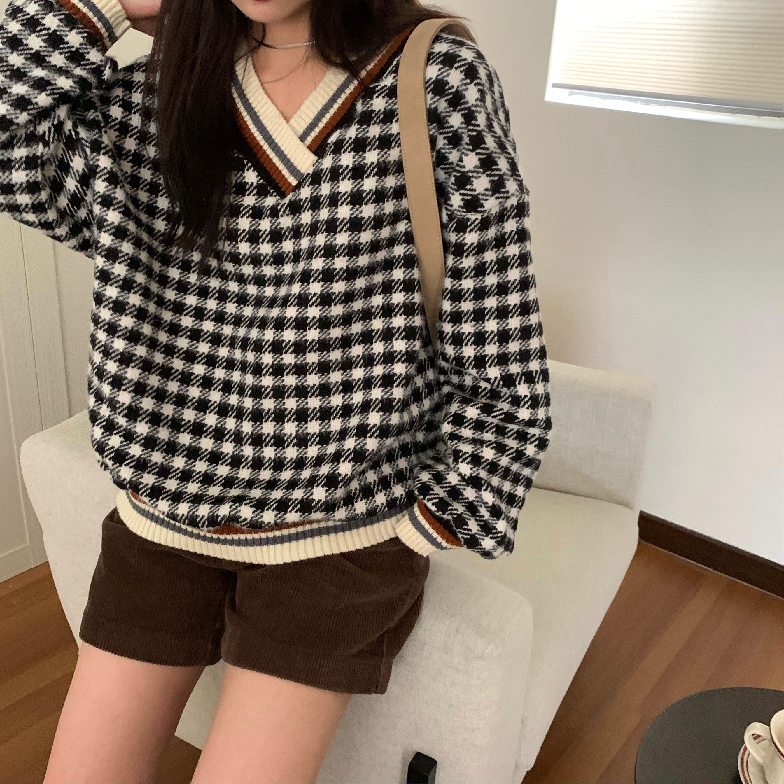 スタンダードカラーVネック格子柄 チェックニット セータールーズジャケット 上着 コート ロング マキシロング丈 マキシ丈 レトロ 女性 レディース 可愛い系80280812109 | nice import1 a5