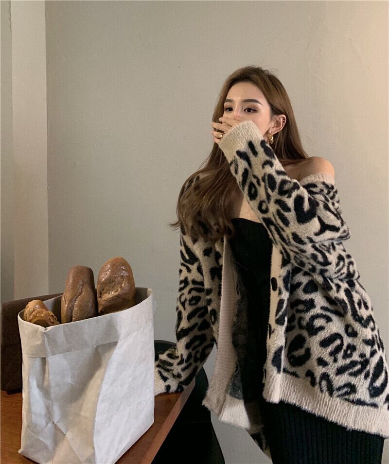 スタンダードレオパードプリント柄ニット セーターカーディガン 上着ジャケット 上着 コート レトロ 女性 レディース 可愛い系1193032785