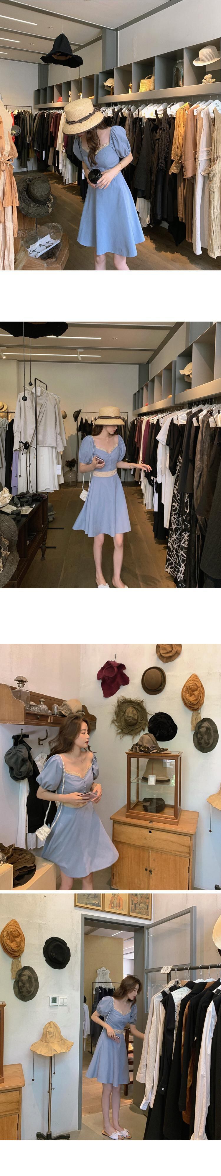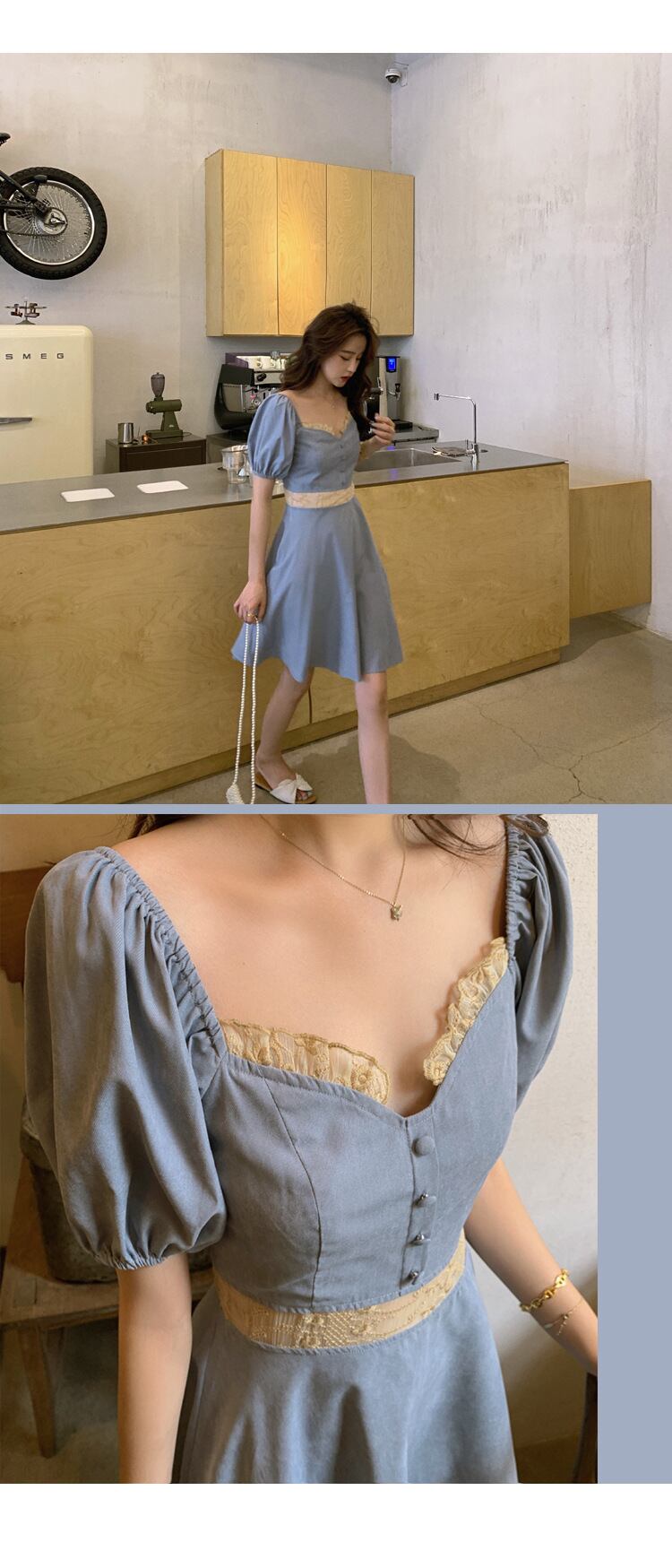 カラースタンダードドレス ワンピース刺繍スリーブ 袖スタイルブルー 青 レトロ レース スクウェア スクエア ステッチ 女性 レディース フェミニン系27875347464 | nice import1 a5