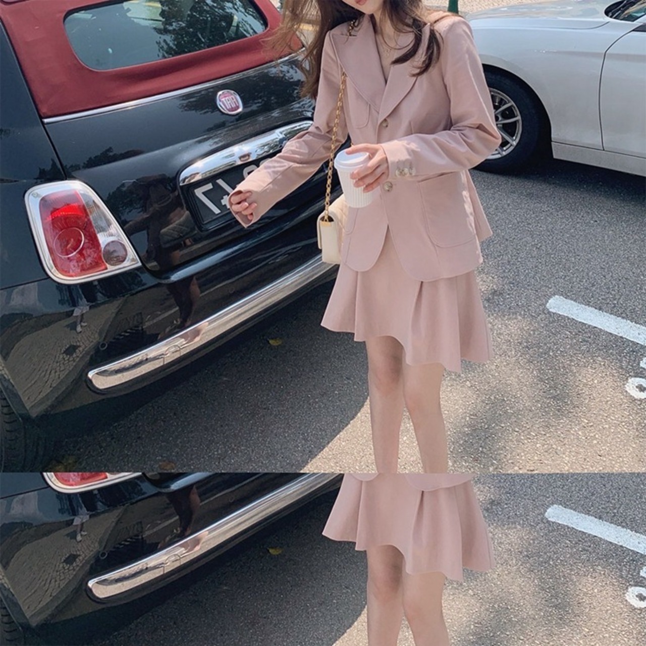 色:ロサンゼルスネイビースーツ,ピンクのスーツ,ロサンゼルスネイビーブルースカート,ピンクのスカート,ストライプシャツ,白のシャツ,LAプリーツスカートから脱出,青いシャツ