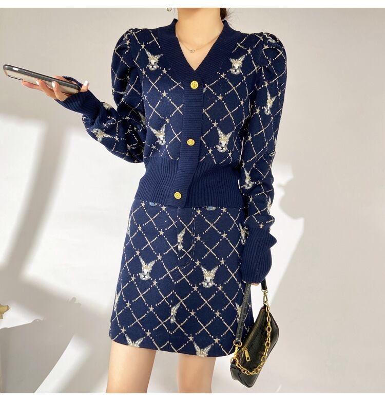 スタンダードスリーブVネックカーディガンニットスカート レトロ 女性 レディース カワイイ系92666992688