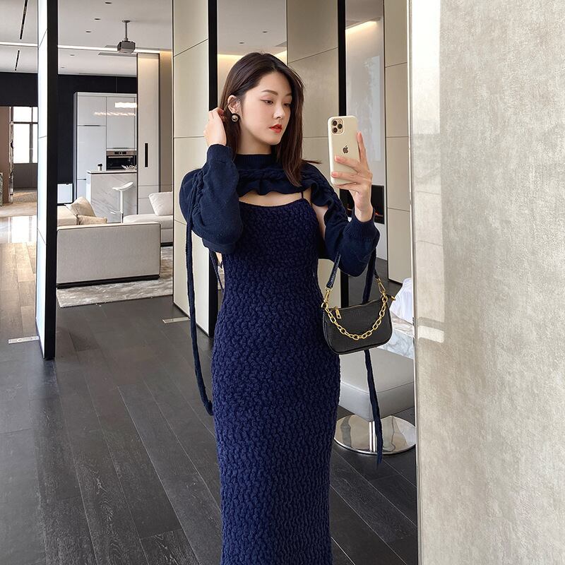 色:ダークブルーのショールスポット,ダークブルーのサスペンダースカート-在庫あり