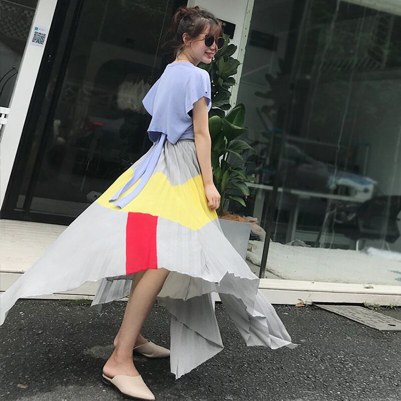 レッドイエロー薄手プリーツスカート ステッチ 女性 レディース カワイイ系57732628225