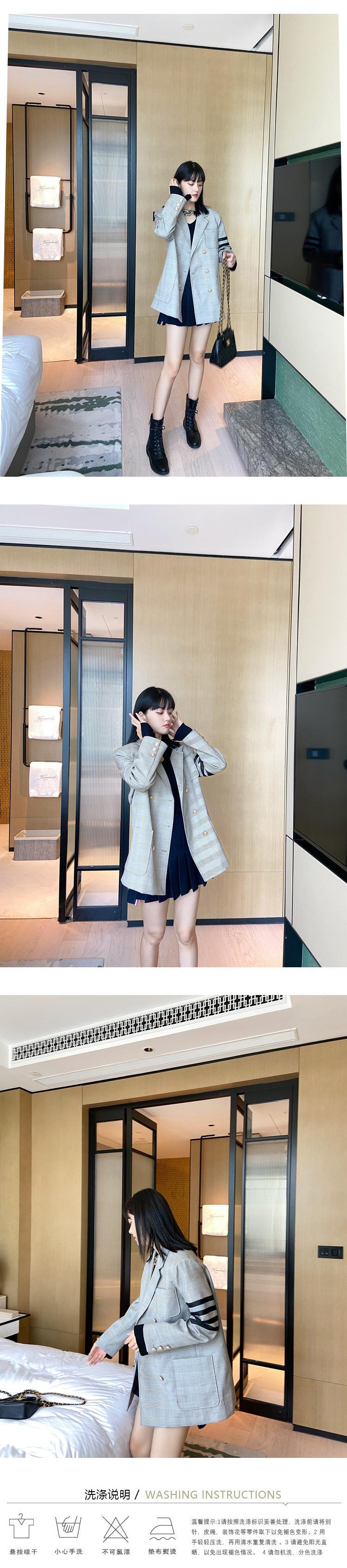 色:チェック柄のスーツジャケットスポット,ディープシーブルーベストスポット,ディープシーブルーカーディガン-スポット,ネイビーブルーのスカートスポット,ネイビーブルージャケット-スポット