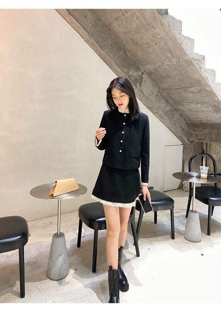 色:ブラックスタンドカラーラインストーンデコラティブジャケット-スポット,ラインストーン裾のブラックスカート-在庫あり